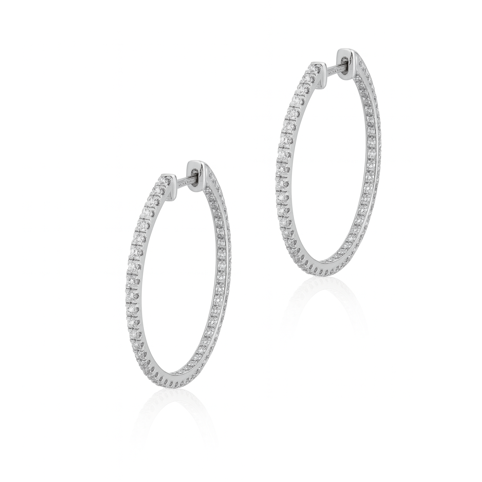 Elegant, refined and made for everyday luxury, these 18ct white gold diamond hoops are crafted in the Appleby workshop with exceptional attention to detail. Each hoop features a full row of sparkling round brilliant diamonds on the outer edge — and an additional hidden line of diamonds set inside the band for extra brilliance from every angle.