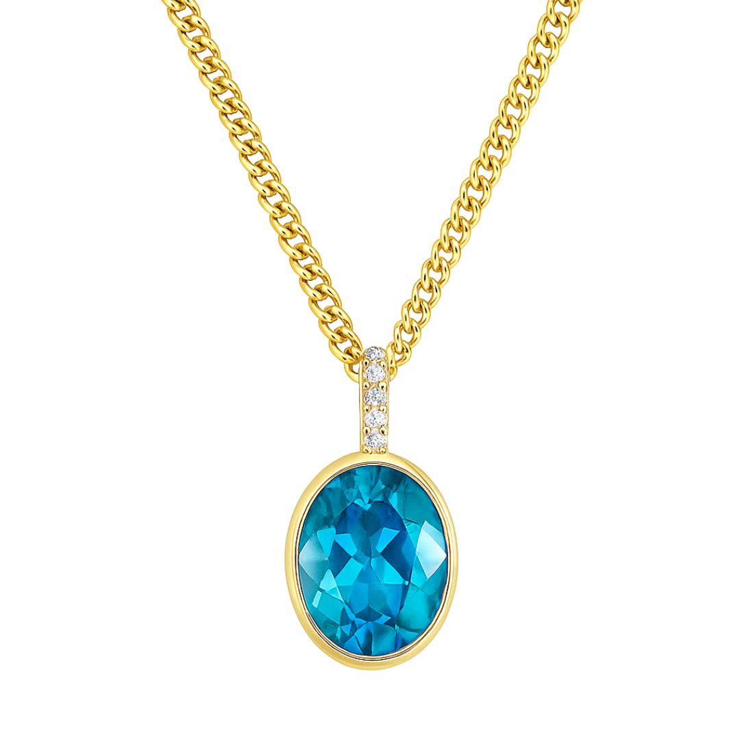 Crafted in radiant 18ct yellow gold, this elegant pendant features a striking oval-cut blue topaz, bezel-set to highlight its vivid brilliance and depth of colour. The pendant is accented with a trio of round brilliant-cut diamonds totalling 0.02ct, adding a refined sparkle to the design. Suspended from a polished gold chain, this timeless piece captures a perfect balance of colour, light, and luxury,a beautiful statement for any occasion.