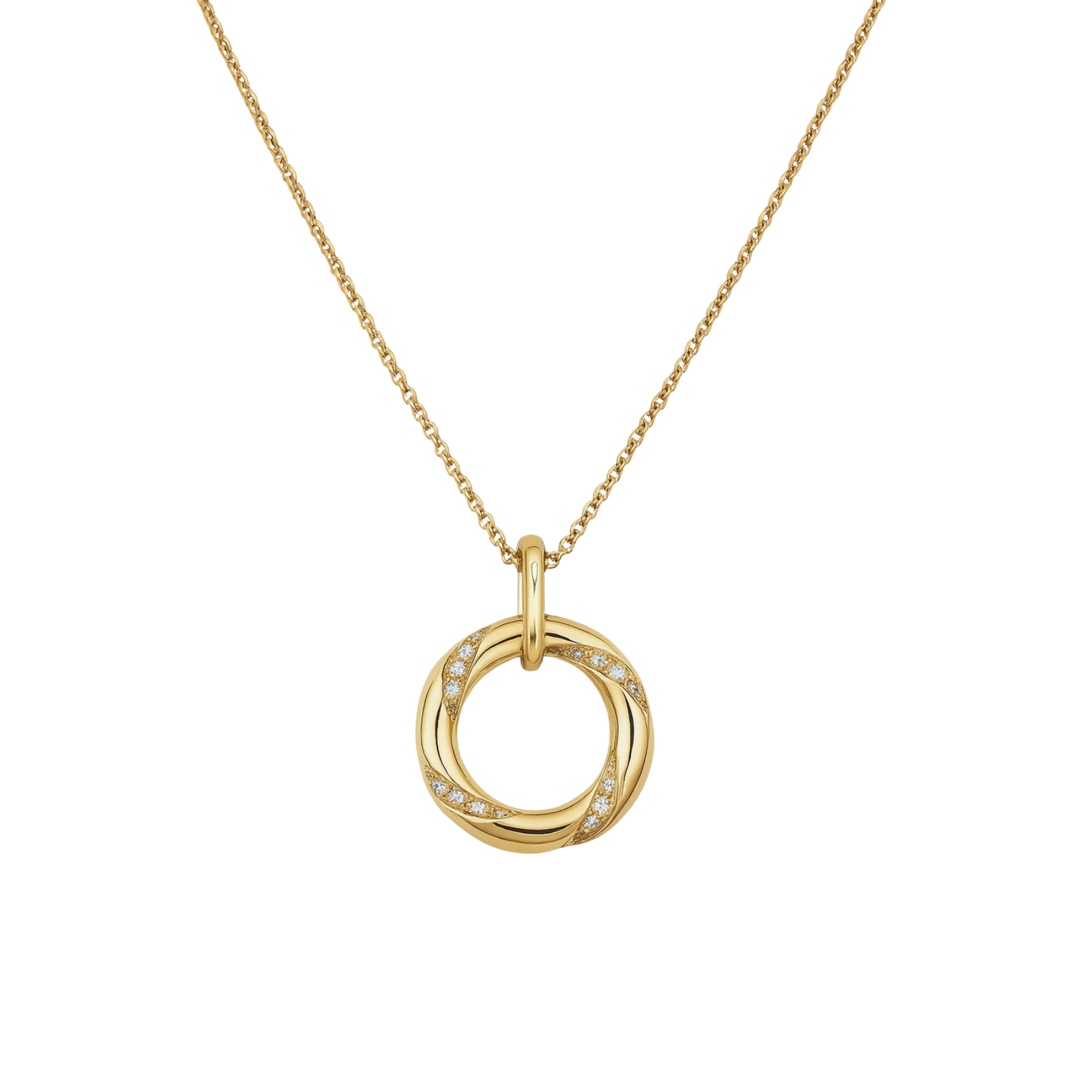 Introducing the Diamond Wreath Pendant, crafted in luminous 18ct yellow gold and set with 0.12ct of natural diamonds. The sculpted circular form features a distinctive twisted design, where polished gold sweeps seamlessly into pavé-set diamond sections — creating a soft, flowing wreath of light.