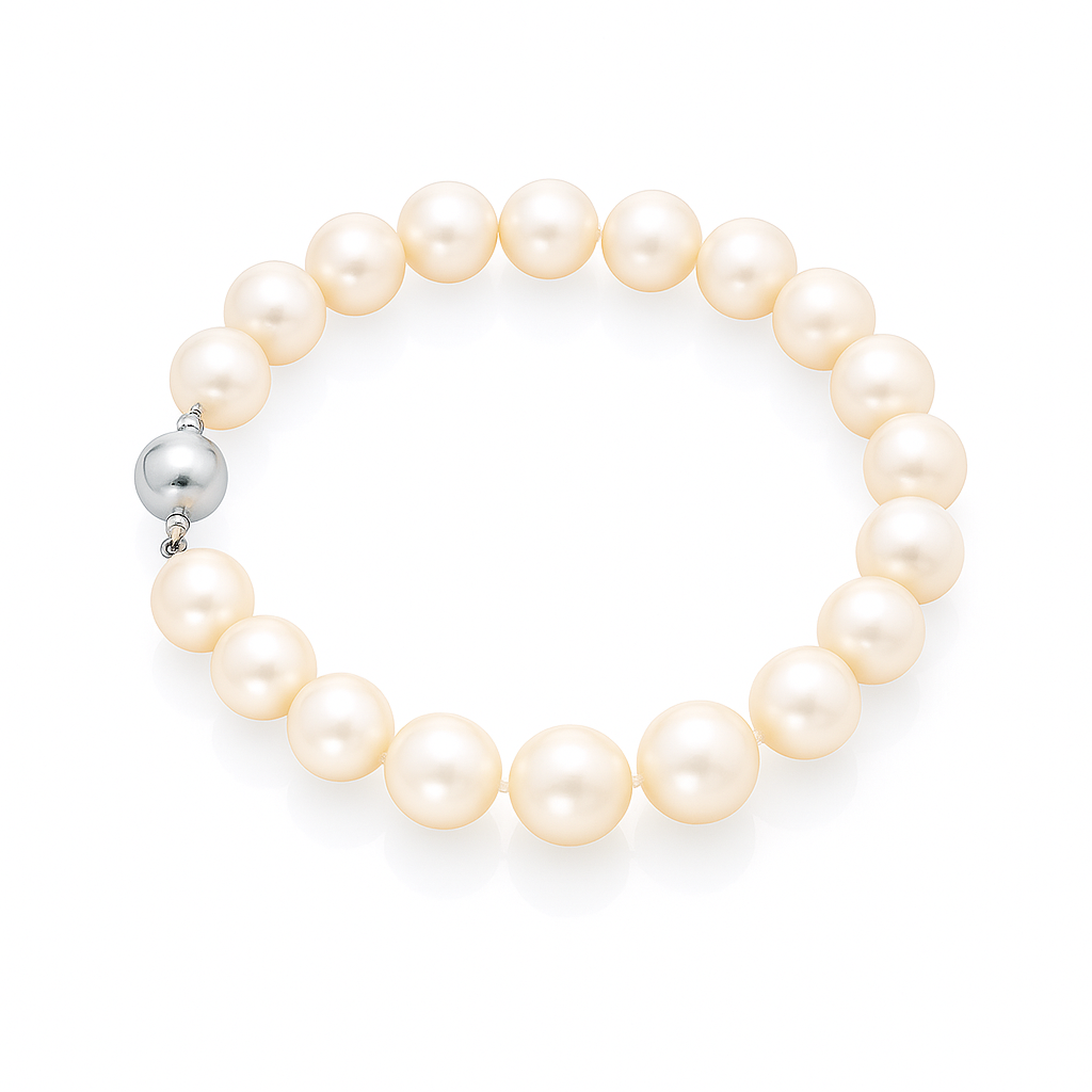 This elegant bracelet features hand-selected freshwater pearls measuring approximately 8–8.5mm, chosen for their luminous lustre and smooth, even surfaces. The bracelet is finished with a 9ct white gold ball clasp, offering both a secure fastening and a refined touch of luxury.