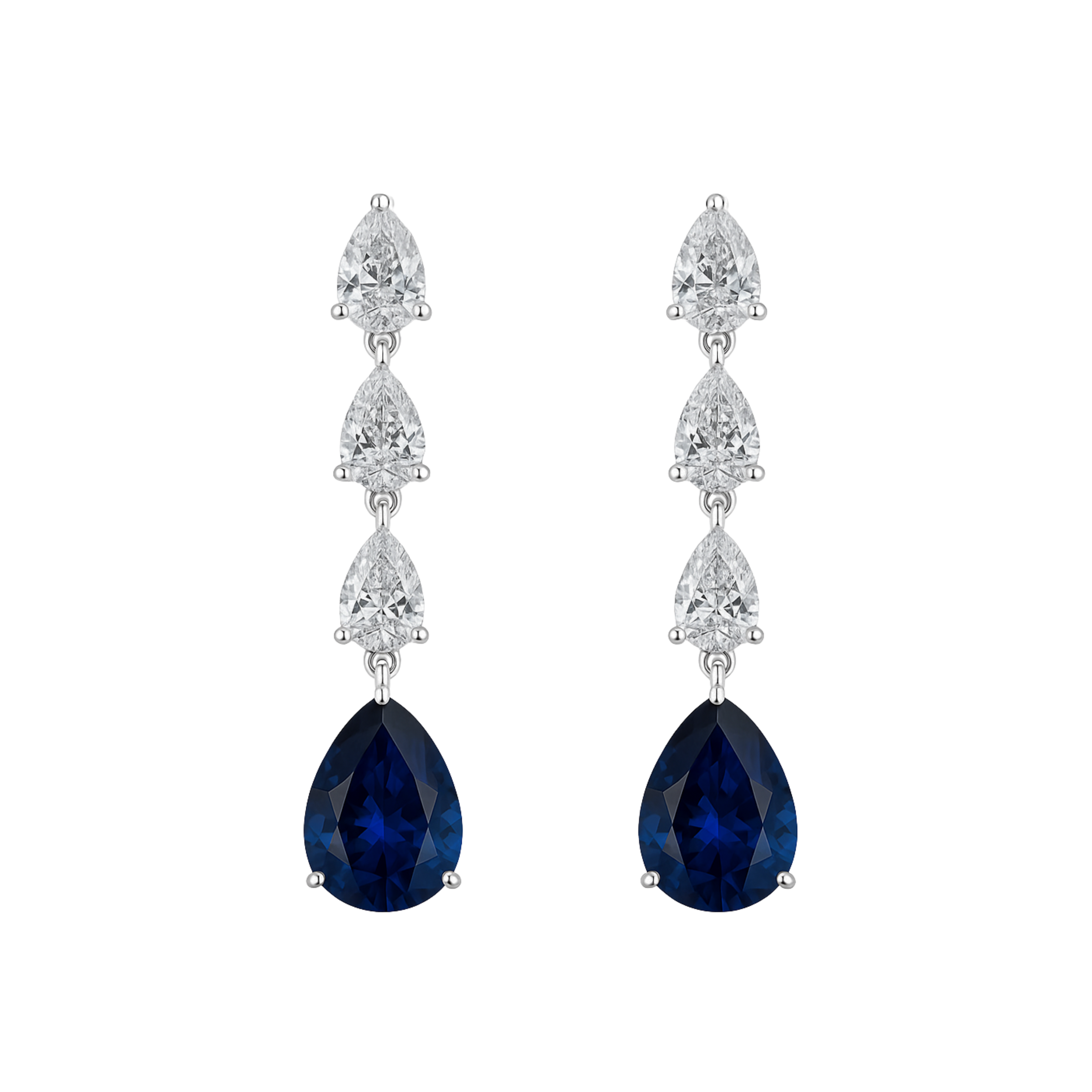 Crafted in luminous 18ct white gold, these exquisite earrings feature a trio of pear-cut diamonds gracefully cascading to a pair of vivid blue sapphires totalling 2.15 carats. Each sapphire is certified, displaying exceptional depth and vivid brilliance of colour.
