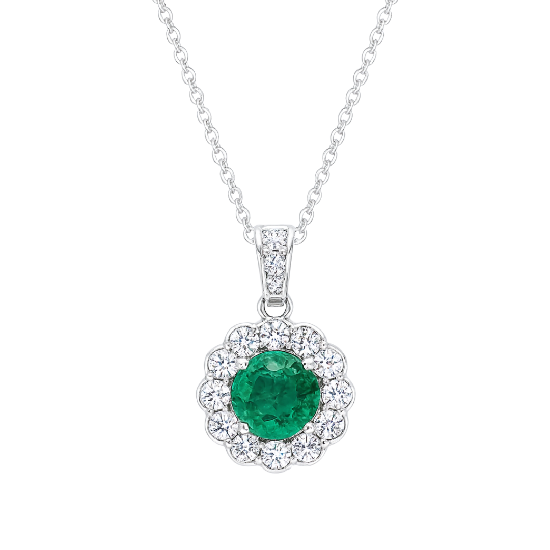 A radiant 0.67ct round emerald sits at the heart of this elegant cluster pendant, encircled by 0.32ct of brilliant diamonds for a timeless, floral-inspired halo effect.