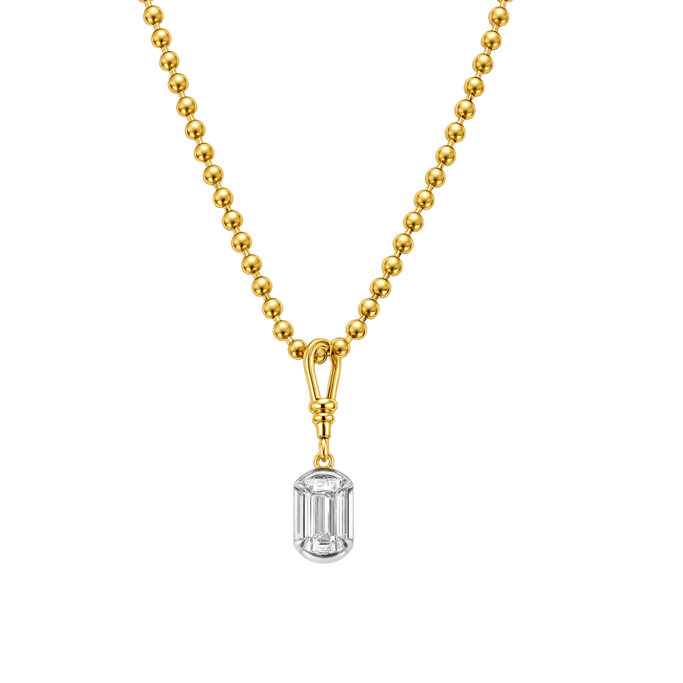 The diamond’s refined facets create a prism-like effect, drawing the eye with its crisp geometry and luminous clarity. Set in a contrasting white gold surround for maximum sparkle, the stone hangs elegantly from 24 inch a sculptural 18ct gold bale.
