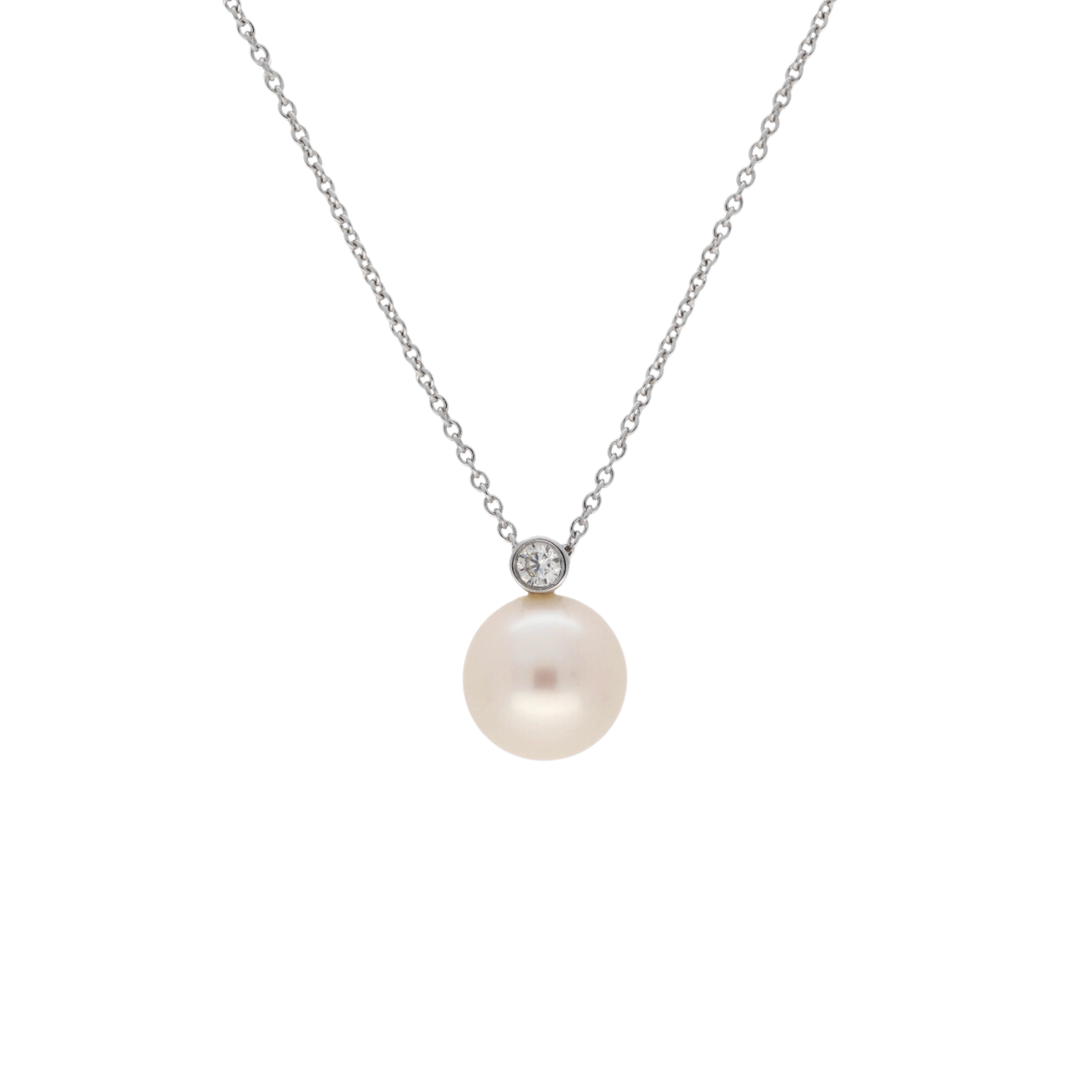 Elegance meets sophistication in this exquisite pearl pendant, crafted from 18ct white gold. A lustrous freshwater pearl takes center stage, radiating natural beauty, while a delicate 0.11ct diamond accent sits gracefully atop, adding a touch of brilliance.