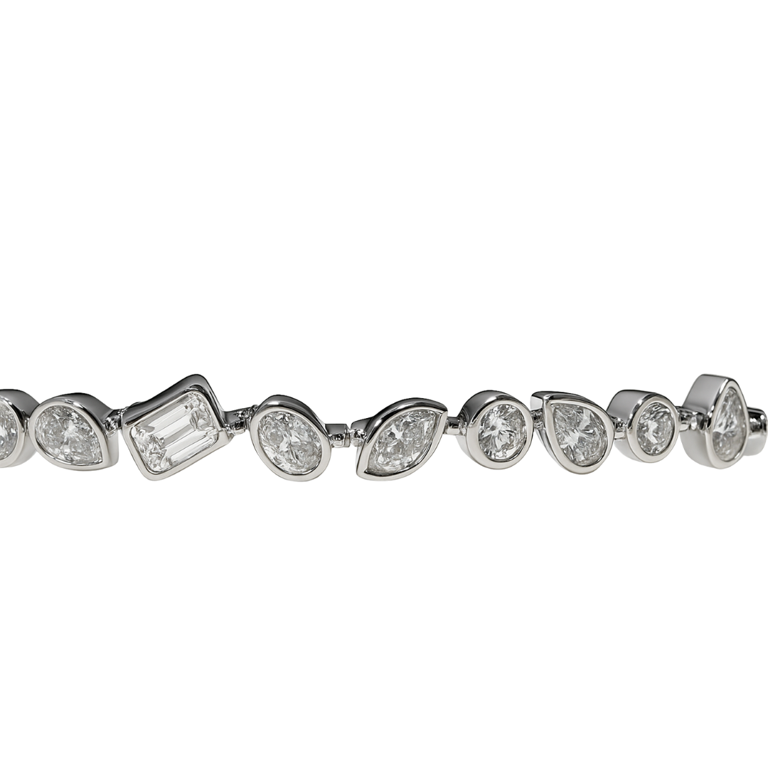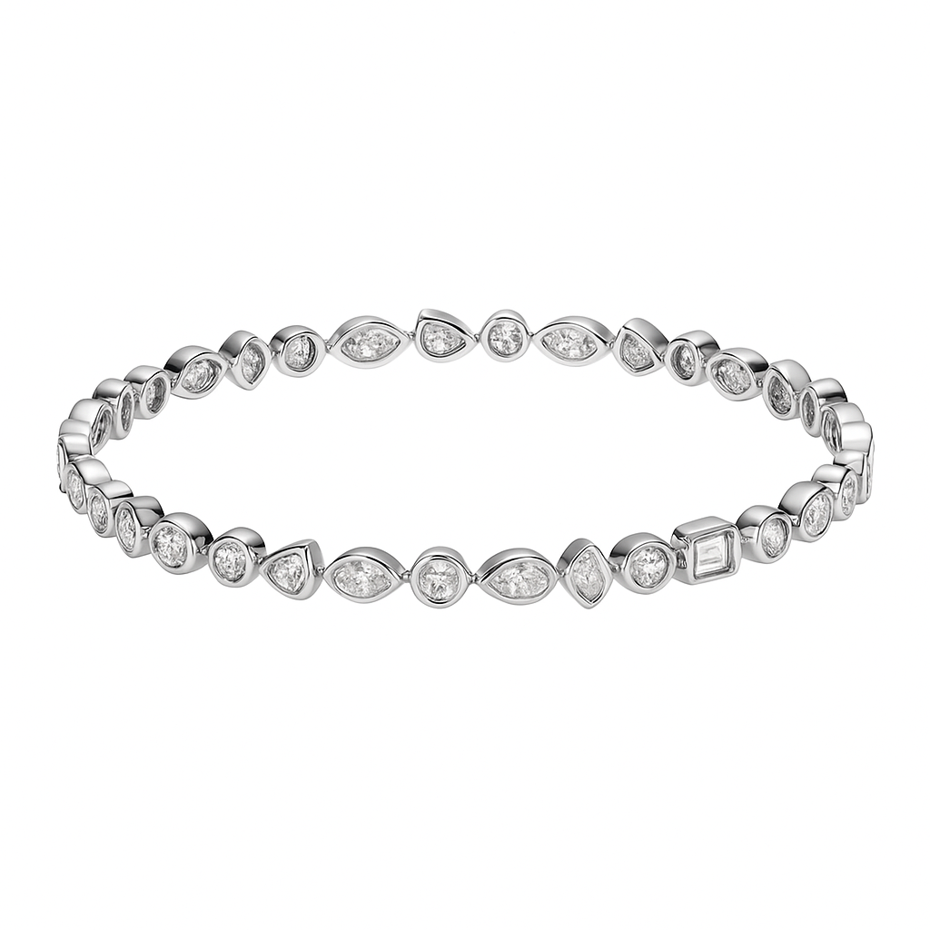 A harmonious composition of round, pear, marquise, and emerald-cut stones creates a rhythm of light and form, each diamond bezel-set to enhance its brilliance and ensure a seamless flow around the wrist.