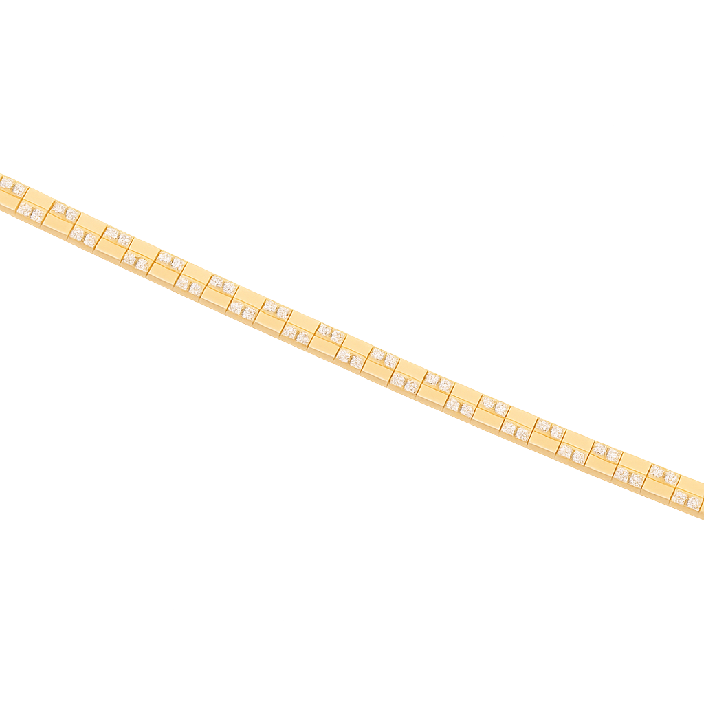 A striking expression of luxury and craftsmanship, this exquisite bracelet is crafted in rich 18ct yellow gold and adorned with 2.10 carats of brilliant-cut diamonds. Each diamond is individually set within sleek square links, creating a fluid line of light that catches the eye with every movement. Elegant yet bold, this bracelet is the perfect finishing touch for special occasions or refined everyday wear.