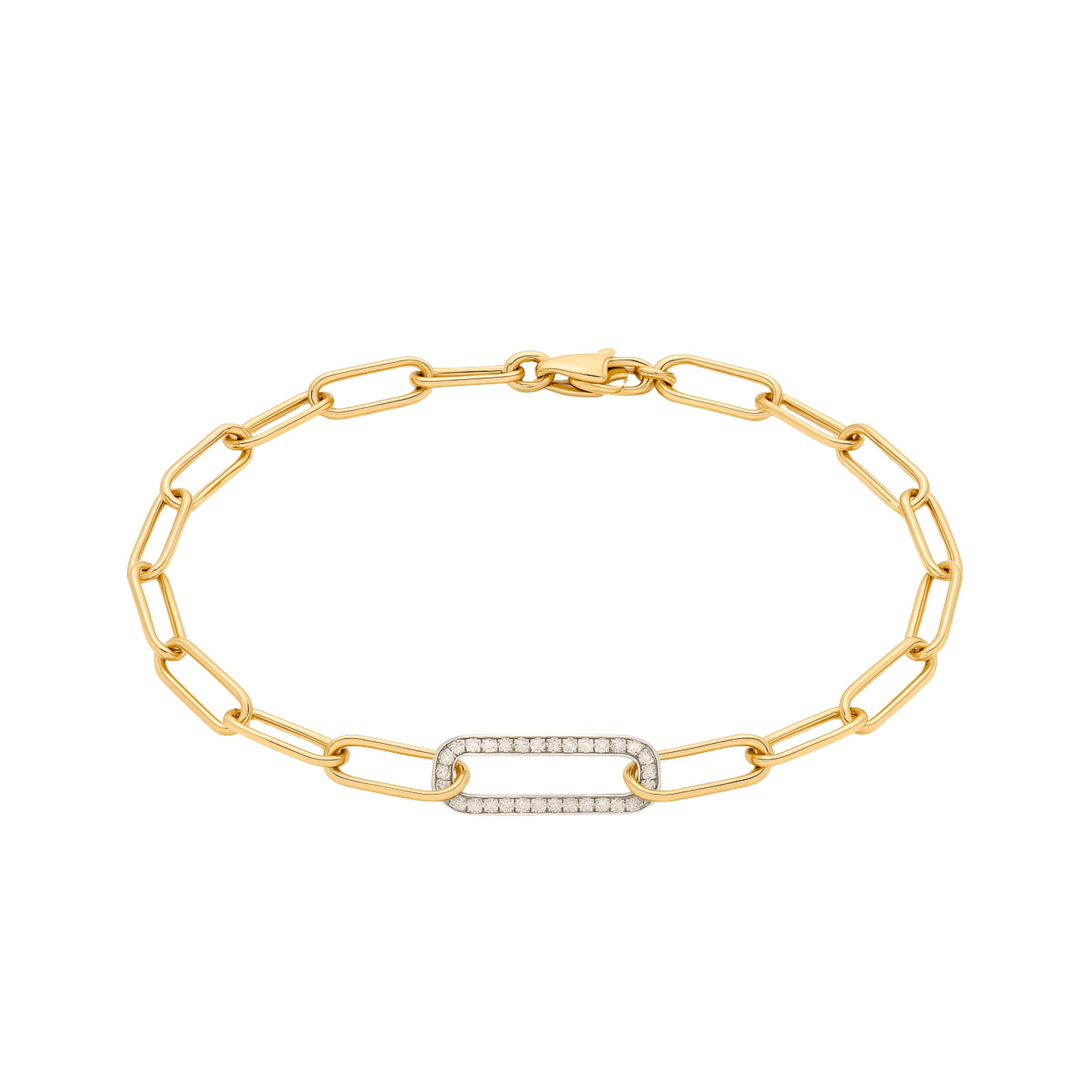 The elongated paperclip-style links give the bracelet a clean, modern silhouette, while the diamond centre link adds subtle luxury and light. Designed for everyday wear yet special enough for evening, it’s the perfect balance of simplicity and sophistication.
