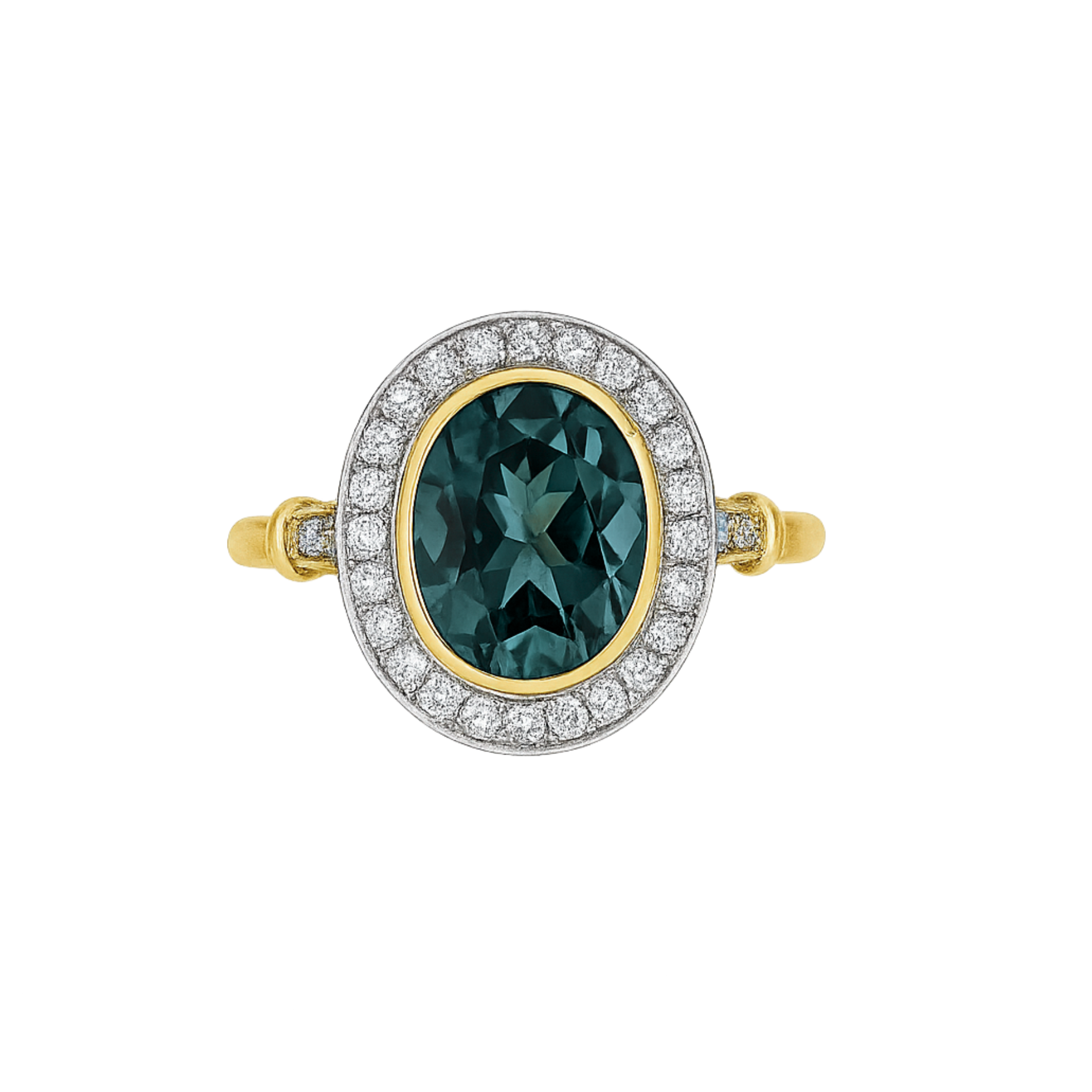 The Cleo showcases a beautifully faceted natural green tourmaline, celebrated for its rich, deep teal-green tones that shift gracefully with the light. The oval centre stone is framed in warm 18ct yellow gold, enhancing its vibrant colour and giving the ring a regal, antique-inspired presence.