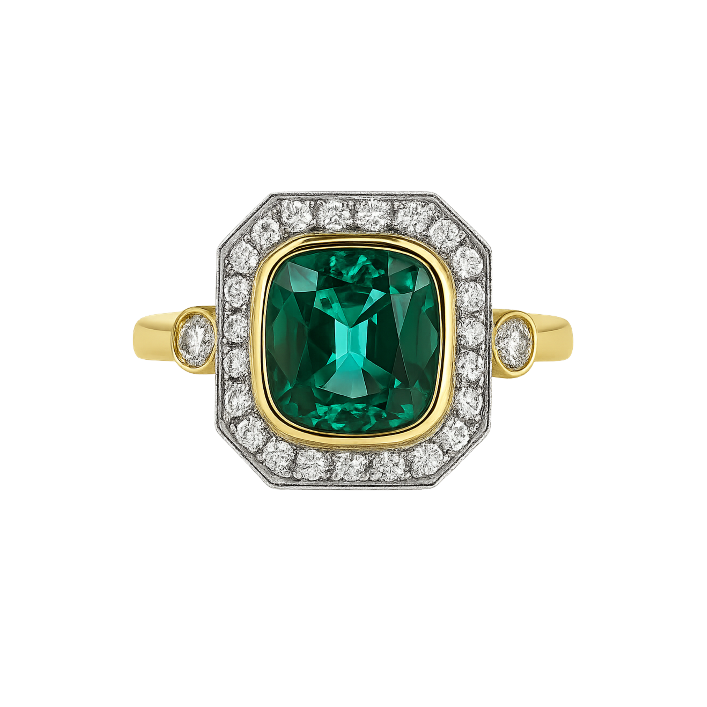 The Cleo Ring channels the bold elegance of the Art Deco era. Featuring a deep green cushion-cut tourmaline, the centre stone is bezel-set in 18ct yellow gold and framed by a crisp octagonal halo of brilliant-cut diamonds.