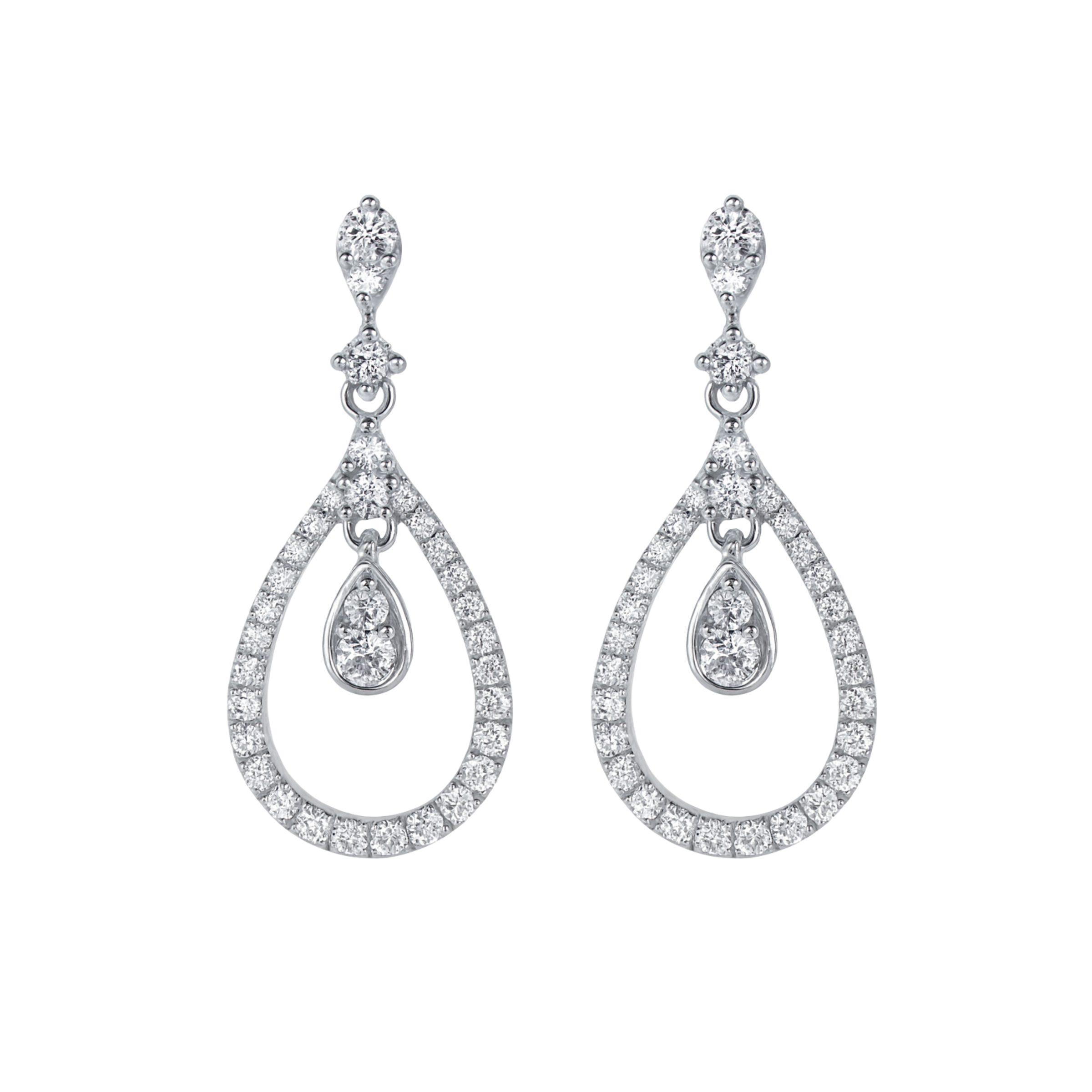 Elegant, refined, and beautifully crafted, these 18ct white gold drop earrings feature a graceful open teardrop silhouette outlined with pavé-set diamonds. At the centre of each earring, a delicate pear-shaped diamond drop adds movement and brilliance, catching the light with every turn.