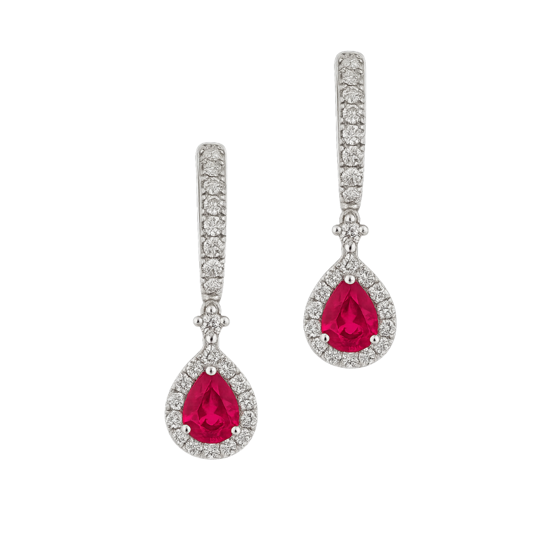 Radiant, refined, and beautifully expressive, these earrings showcase two vivid pear-cut rubies totalling 0.75 carats, each selected for their rich, velvety red hue and exceptional luminosity. The rubies are framed by delicate halos of round brilliant diamond pavé, adding a soft, sparkling outline that enhances the gems’ intensity.