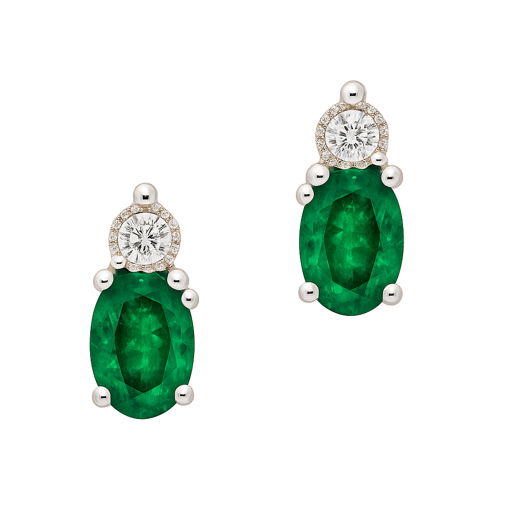 Crafted in 14ct white gold, these exquisite drop earrings showcase the enduring beauty of natural gemstones. Each earring features a vivid oval-cut emerald (0.94ct total) suspended beneath a brilliant round diamond (0.06ct total), delicately framed in a polished white gold setting.