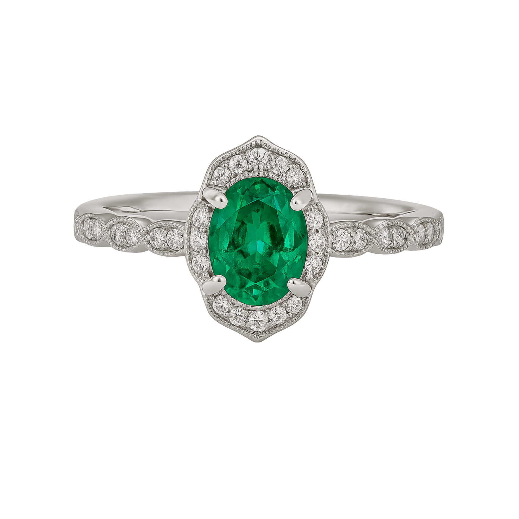 Inspired by timeless heritage elegance, this exquisite ring features a vibrant 0.75ct oval-cut emerald at its centre, celebrated for its rich green hue and natural beauty. Surrounding the emerald is a delicate diamond-set scalloped halo, with further diamonds adorning the intricately detailed shoulders. The total diamond weight is 0.25ct, adding brilliance and contrast to the emerald’s striking colour.