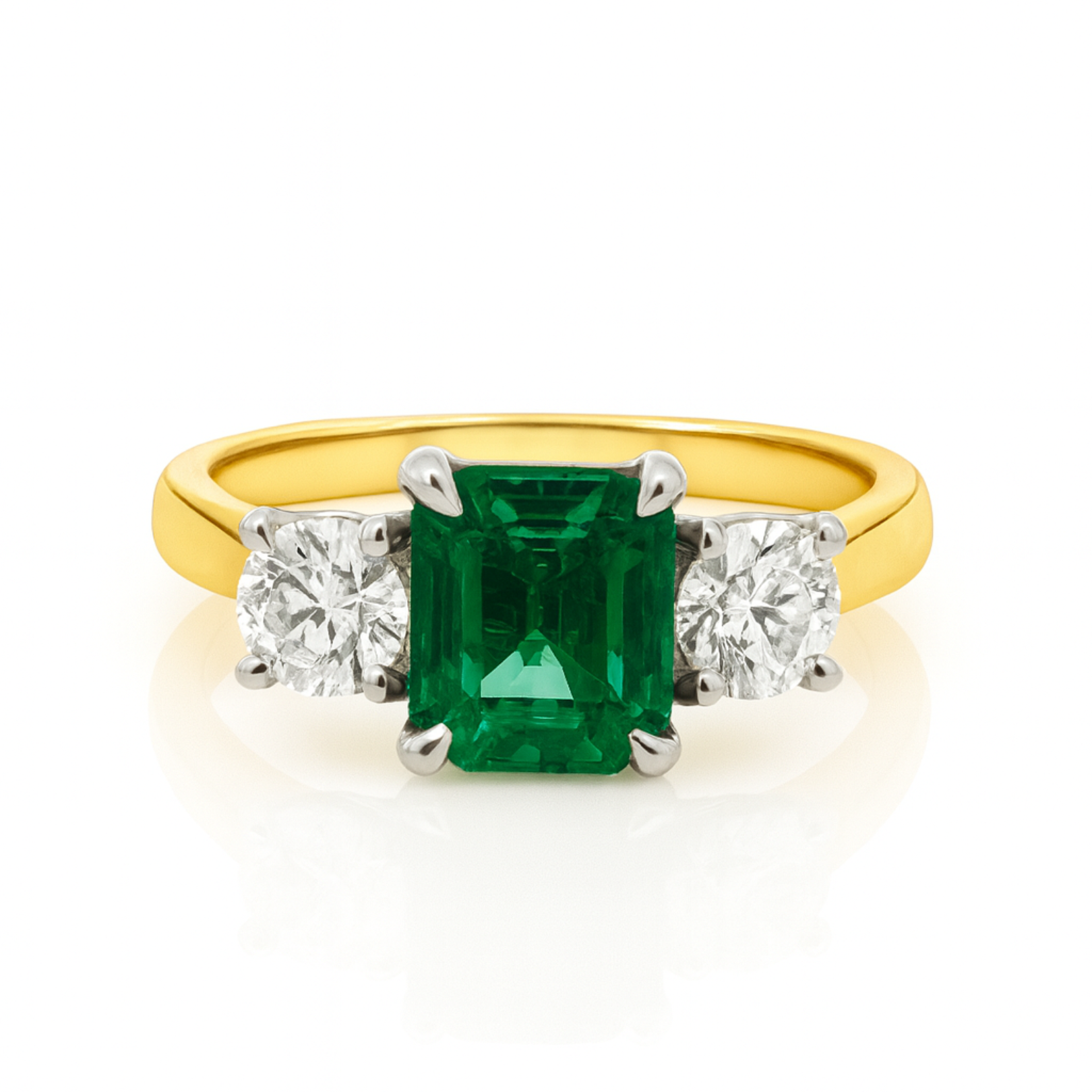 Timeless, vibrant, and beautifully crafted, this exquisite three-stone ring features a striking 0.88ct emerald-cut emerald at its centre, a gemstone treasured for its rich, vivid green colour and unmistakable character. The emerald is flanked by two exceptional E-colour round brilliant diamonds, totalling 0.80ct, each selected for their brightness, fire, and remarkable purity.