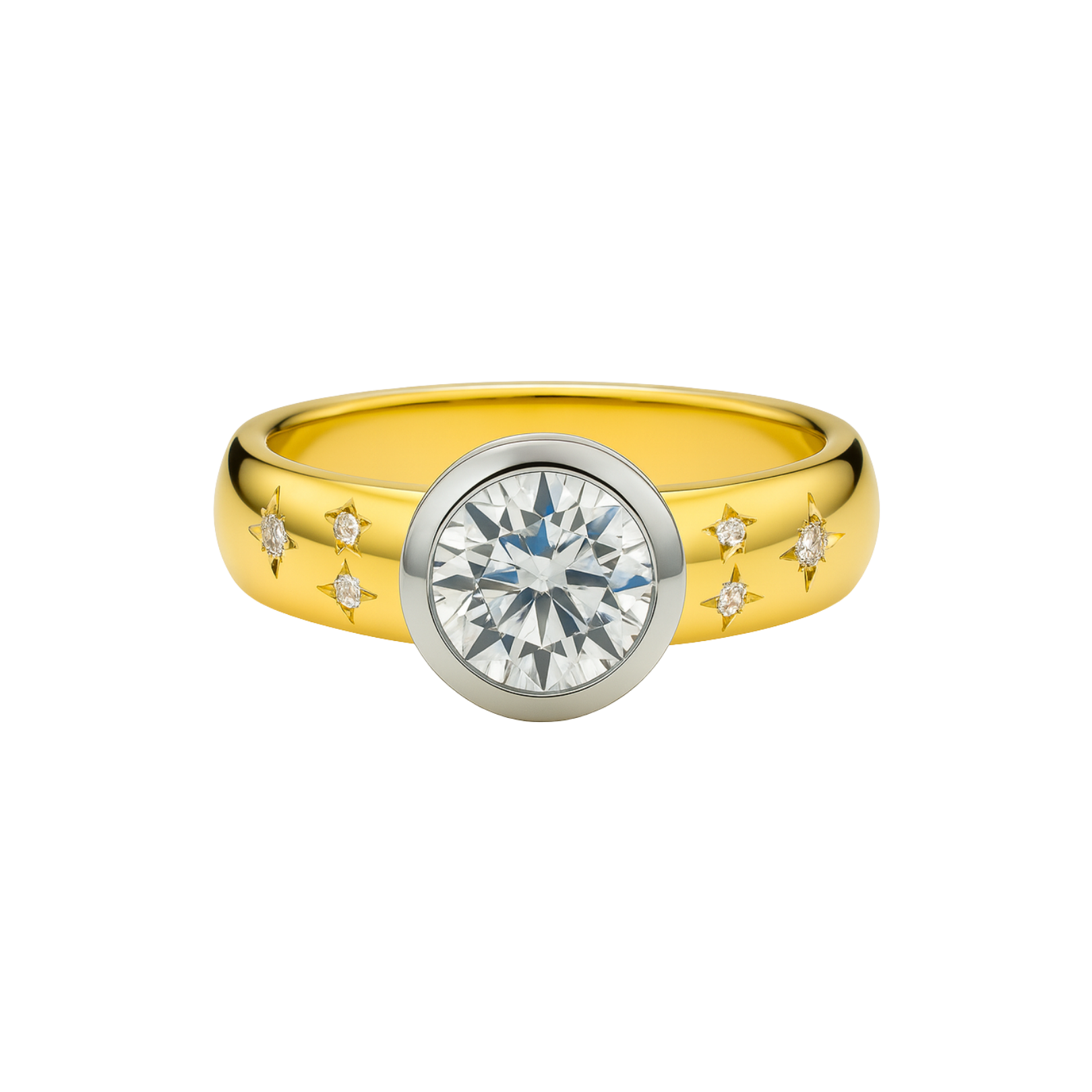 Bold, modern and cosmically inspired, The Celeste is a striking design that can be worn as an engagement ring or a statement dress ring. At its heart sits a 1.20ct round brilliant diamond, graded Triple Excellent for cut, polish and symmetry — the highest standard achievable, ensuring unmatched sparkle and precision.