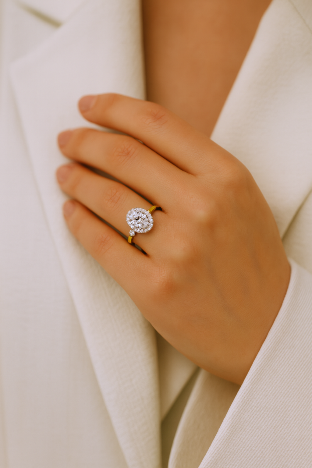 Graceful and radiant, The Maiden Ring embodies refined simplicity and timeless beauty. At its centre lies a 1.01ct oval-cut diamond, graded E colour for its near-perfect whiteness and dazzling brilliance. A delicate halo of round brilliant diamonds embraces the centre stone, while two additional side diamonds enhance the symmetry and sparkle, bringing the total diamond weight to 1.30ct.