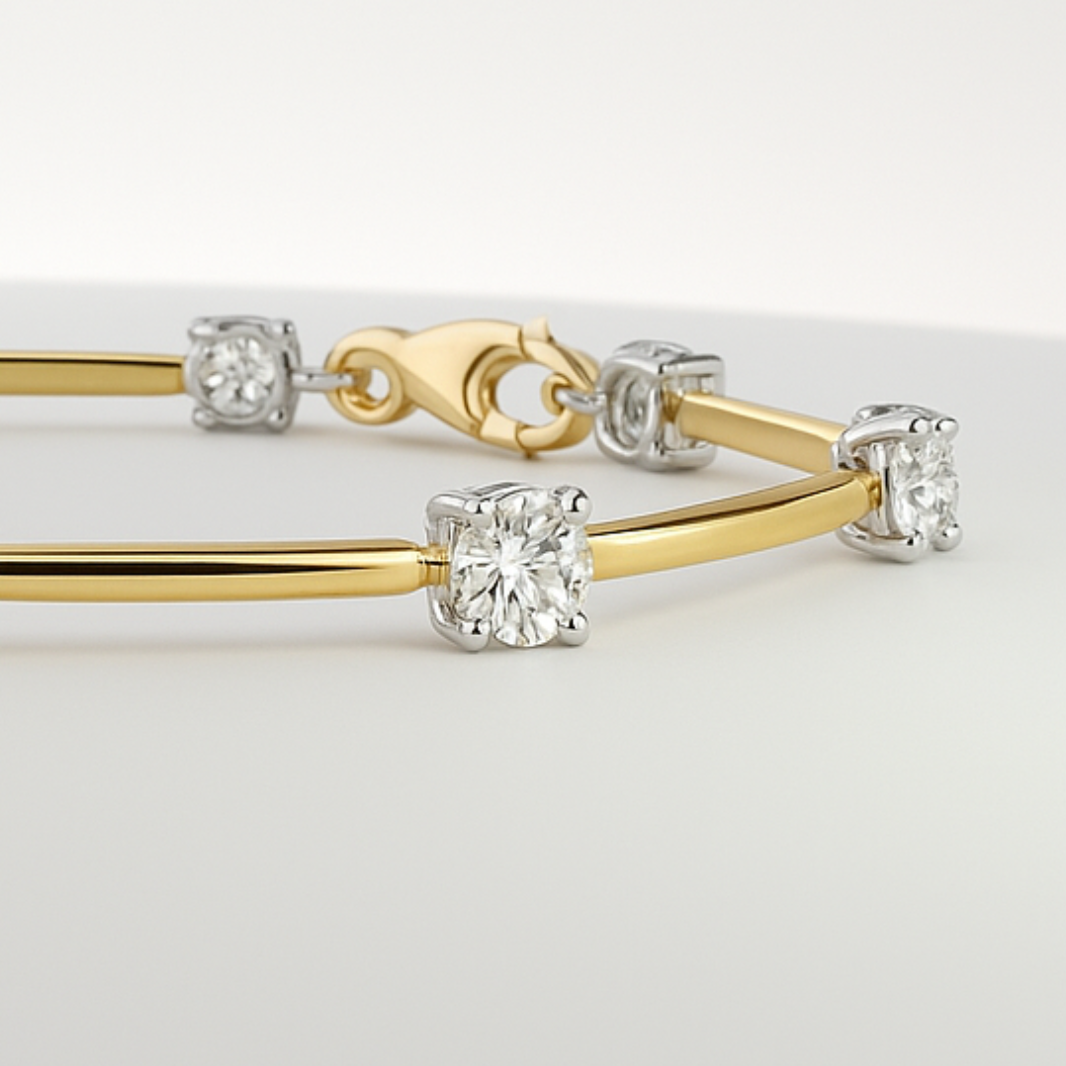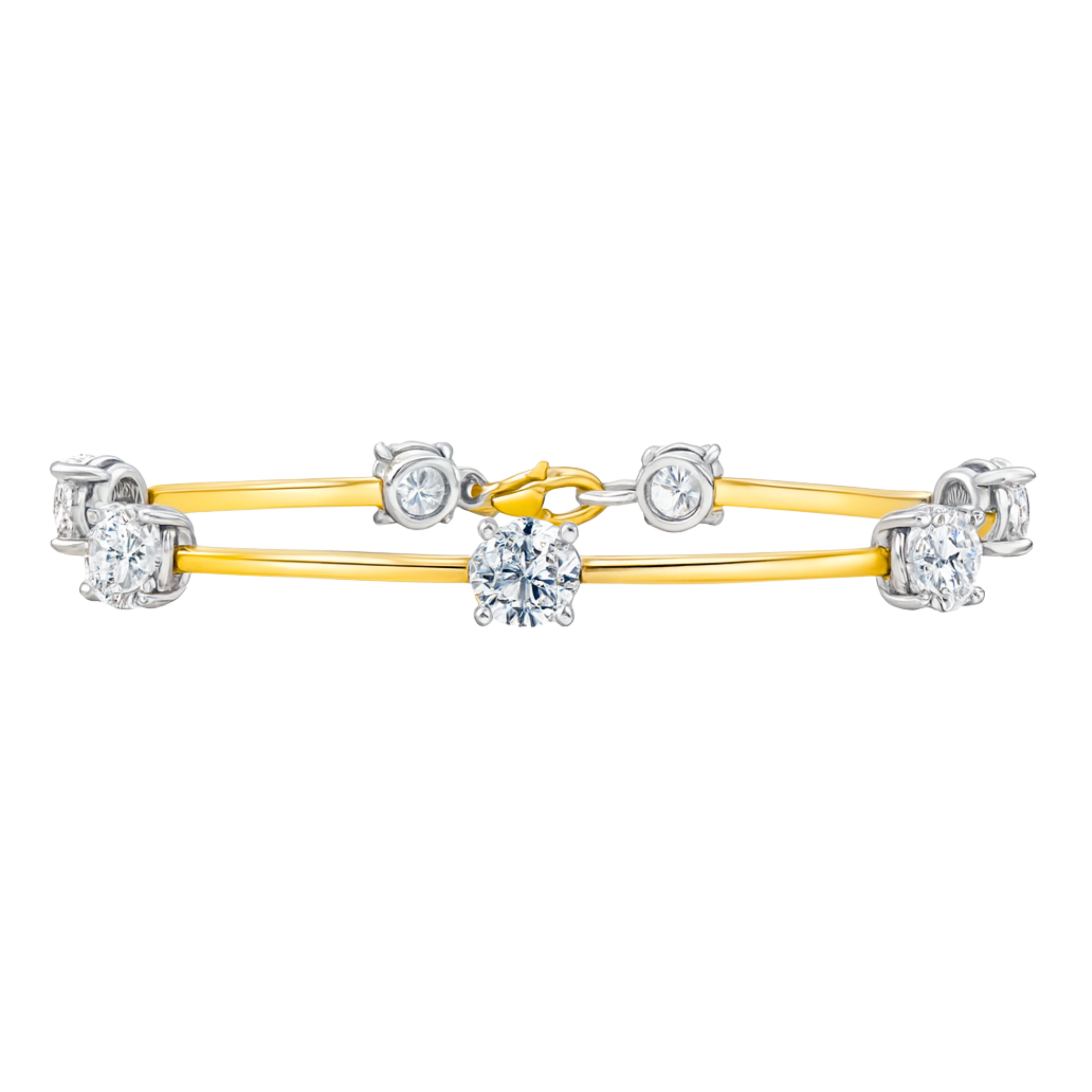 Crafted in 18ct yellow gold, the bracelet offers a warm, graceful contrast to the crisp brilliance of the platinum and diamonds. The alternating gold bars and platinum-set diamonds create a soft rhythm of light, refined, contemporary, and endlessly wearable.
