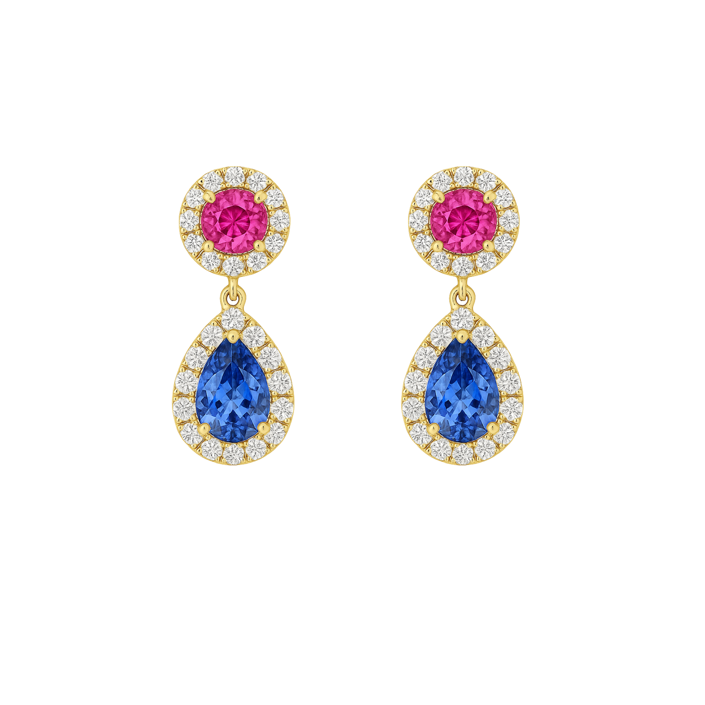 Each sapphire is framed by a delicate halo of natural diamonds, adding sparkle and refinement while enhancing the gemstones’ brilliance. The round-to-pear silhouette creates a graceful drop that moves effortlessly with the wearer, offering both sophistication and a touch of whimsy.