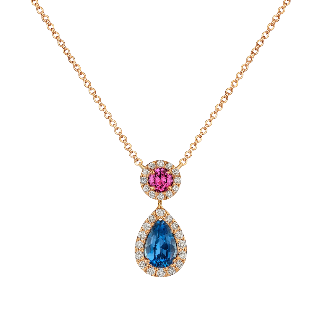 Playful, elegant, and full of colour, The Carousel pendant brings together vibrant gemstones in a beautifully balanced, contemporary design. Set in warm 18ct rose gold, the pendant features a vivid round pink sapphire paired with a striking pear-cut blue sapphire, together totalling 0.51 carats of exceptional colour.