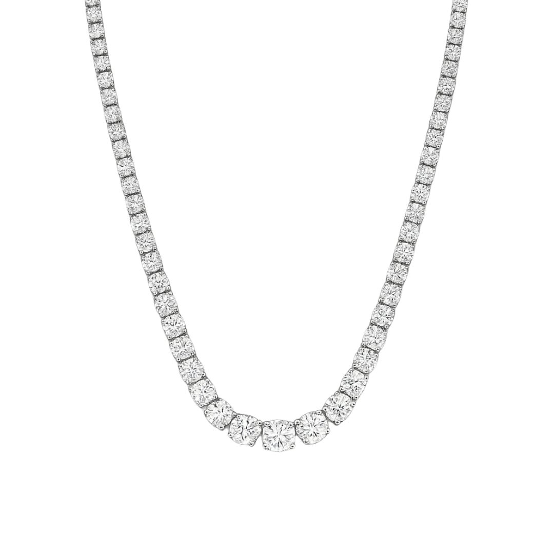 Crafted in luminous 18ct white gold, this exquisite Riviera-style necklace features 132 round brilliant-cut diamonds, totalling 5.03 carats. Each diamond is expertly hand-set in a graduated design, with the diamonds subtly increasing in size toward the centre, creating a natural flow of brilliance that enhances the neckline with perfect balance and symmetry.