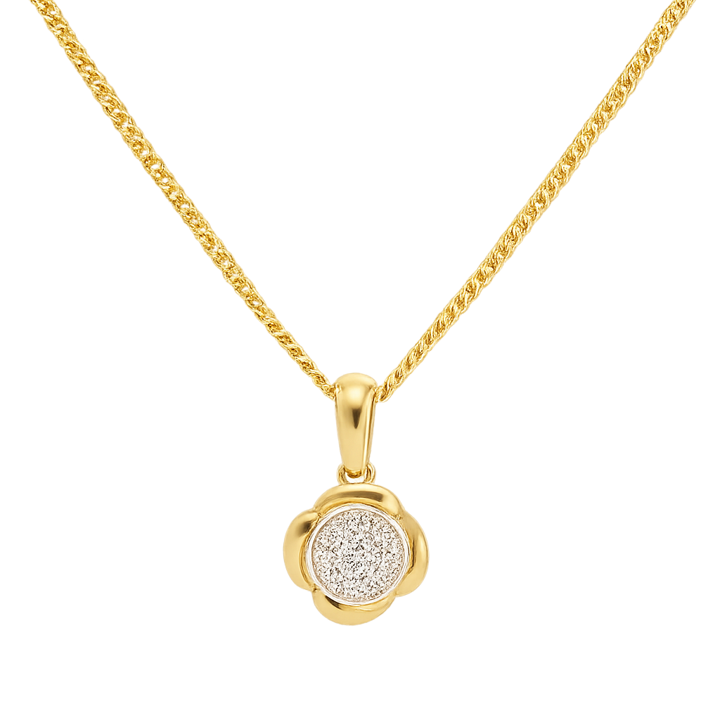 Radiating timeless elegance, this delicate Fleur pendant is crafted in warm 9ct yellow gold and set with a cluster of brilliant round diamonds totalling 0.11ct. The softly sculpted petal design surrounds the diamond centre with a graceful floral silhouette, catching the light beautifully from every angle. Suspended from a fine gold chain, this pendant makes a perfect everyday signature or a meaningful gift for someone special.