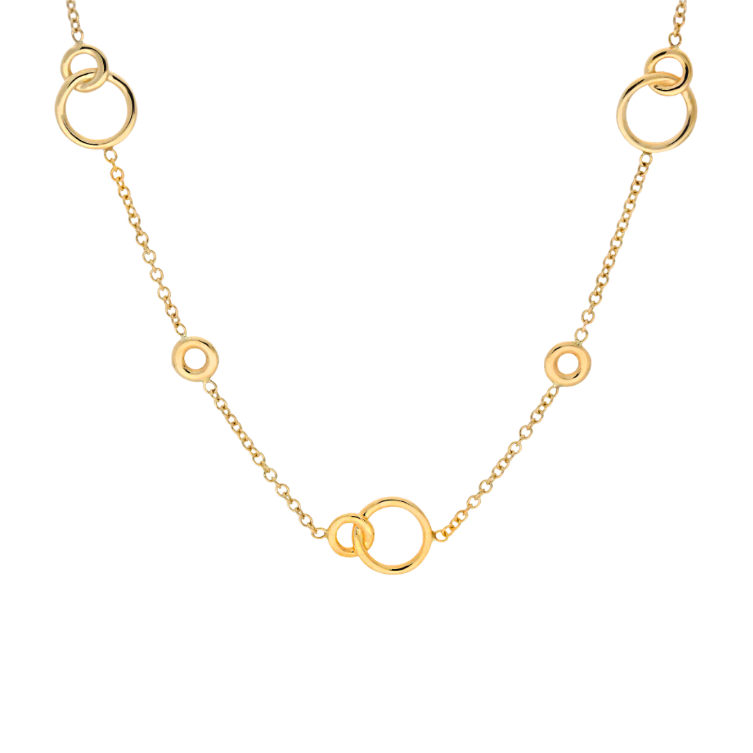 Interlocking, weightless, and quietly expressive — The Interlocking Necklace features a constellation of polished gold circles suspended along a fine 9ct yellow gold chain. With varying loop sizes linked in organic rhythm, it evokes movement, connection, and balance.
