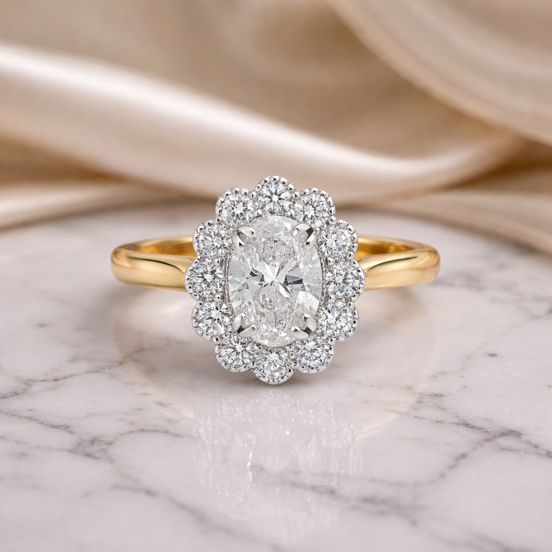 Our signature Kate engagement rings are especially beloved for their soft, romantic beauty. Featuring a brilliant centre diamond encircled by a halo of smaller stones, this design enhances the sparkle and presence of the ring while evoking the grace of a bygone era.